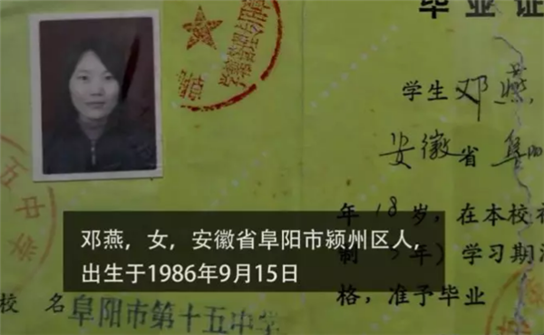 突如其来的家暴让邓燕无法接受,年仅二十岁的她便离家出走,从此音讯全无。毕业证书显示,邓燕毕业于阜阳市第十五中学。