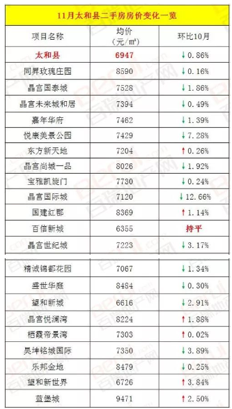 1、太和县11月最新二手房整体房价6947元/㎡,环比10月下降0.86%,二手房房价居阜阳五县城第三!