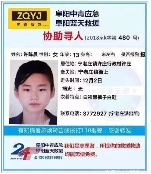 紧急寻人!阜阳13岁女孩离家出走失联已超30个小时,家中老人都急坏了。就是这名女孩她叫许陈晨,今年13岁。离家时身穿白色袄子、黑裤子白鞋。家住颍泉区宁老庄镇许庄行政村许庄,在颍泉某中学上初一。12月2
