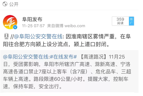 大雾黄色预警阜阳市气象台2018年11月25日02时52分发布大雾黄色预警信号。目前高速公路阜阳南路口和太和、界首、临泉部分路段能见度已经低于500米,出现大雾;预计未来12小时内我市大部分地区将出现