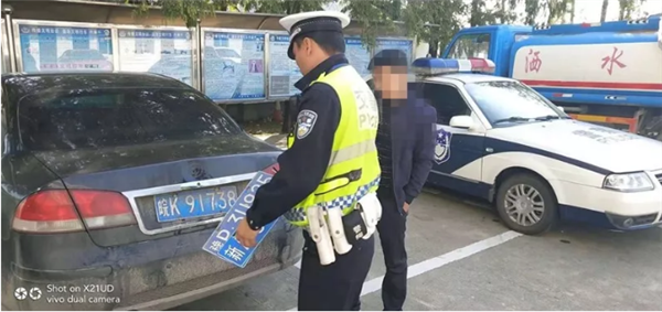 2018年11月9日10时许,阜阳市交警二大队宁老庄交警中队民警通过缉查布控系统预警发现,有一辆涉嫌报废的轿车正在路上行驶。民警迅速上路布控,在105国道901公里颍泉段将嫌疑车辆拦停。民警现场检查发